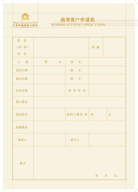 這張是江蘇夢(mèng)溪國(guó)際大酒店的商務(wù)客戶申請(qǐng)表,表上的設(shè)計(jì)內(nèi)容分別有姓名、團(tuán)體、身份、國(guó)籍、人數(shù)、男、女、房號(hào)等等的入店信息(詳細(xì)信息可以圖上的樣式表)。